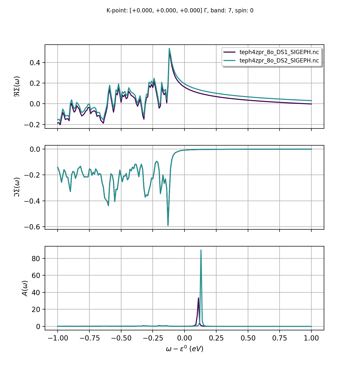 to plot \Sigma_\nk(\ww) and A_\nk(\ww) at the \Gamma point for band index 7 (conduction band maximum). Note that in python indices start from 0 whereas ABINIT uses Fortran conventions with indices starting from 1. In a nutshell, one should substract 1 from the Fortran band index when calling AbiPy functions.