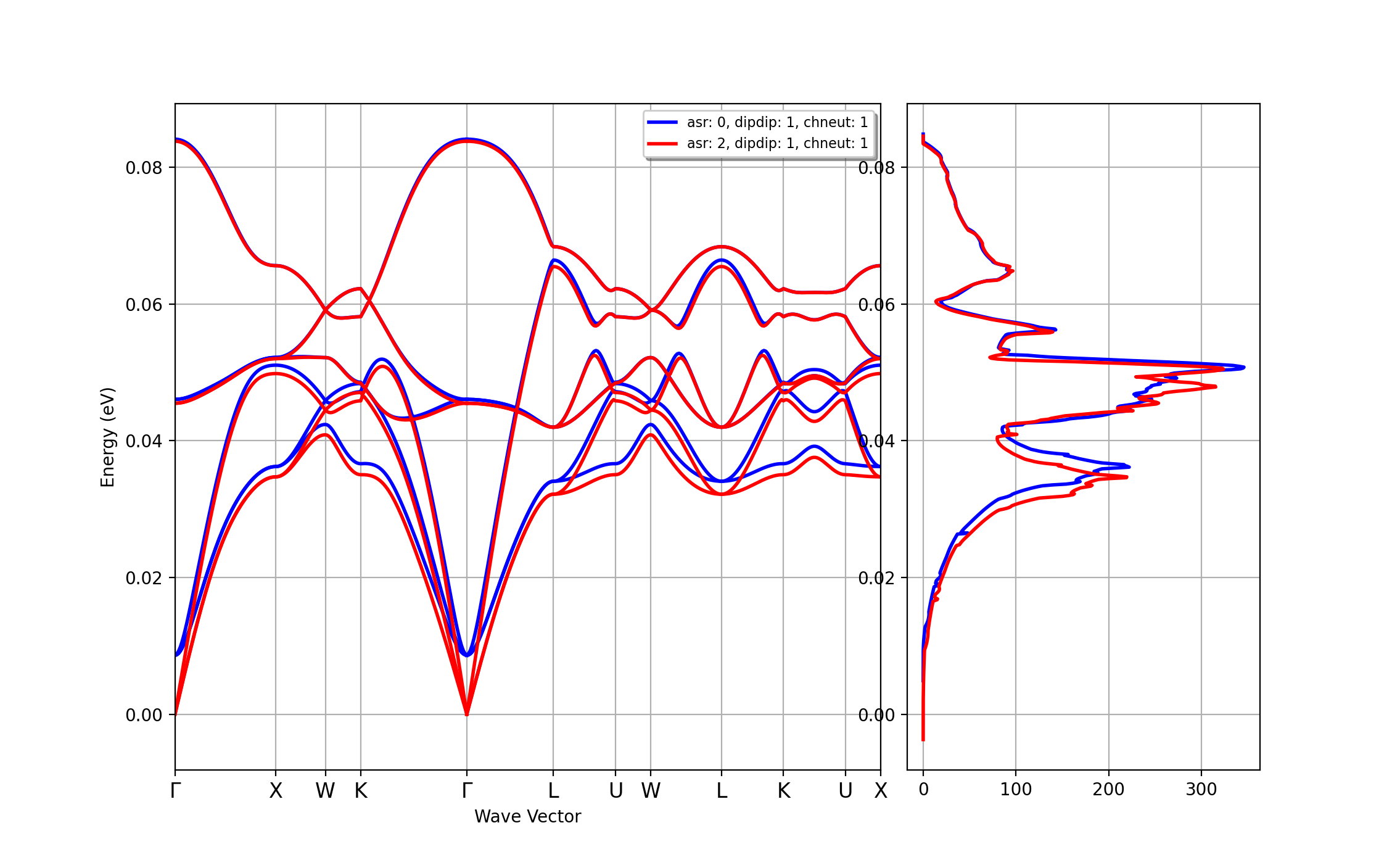 The AbiPy script used to executed the DFPT part is available here. Note that several parameters have been tuned to reach a reasonable compromise between accuracy and computational cost so do not expect the results obtained at the end of the lesson to be fully converged. More specifically, we use norm-conserving pseudopotentials with a cutoff energy ecut of 30 Ha (too low, it should be ~50 Ha). The DFPT computations is done for the set of irreducible \qq-points corresponding to a \Gamma-centered 4x4x4 \qq mesh (again, too coarse). \bm{Z}^* and \bm{\ee}^\infty are also computed with the same underconverged settings.