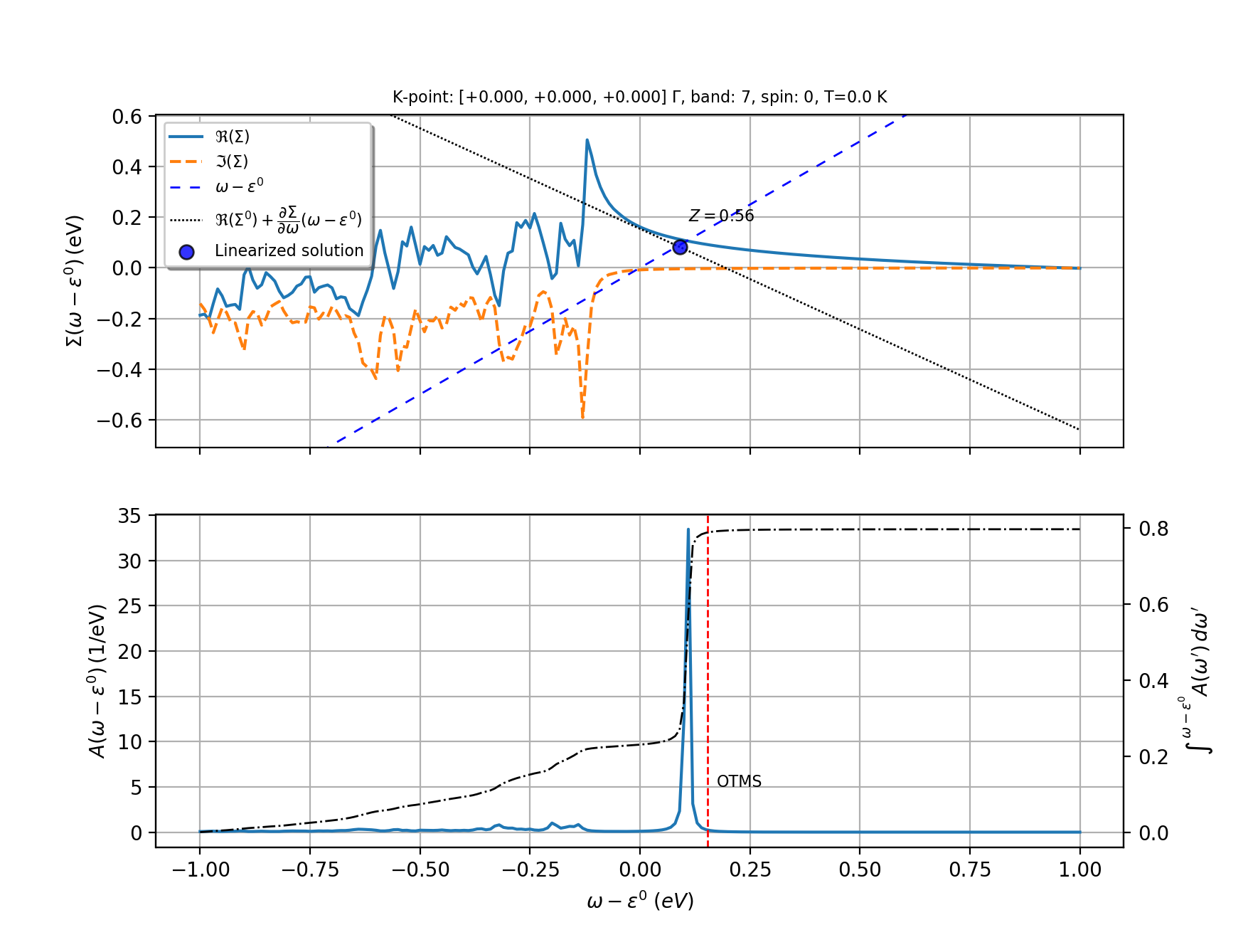 (iiii) The vertical red line in the second figure gives the on-shell QP energy. As already mentioned previously, the OTMS energy derives from a static formalism that reduces to the linearized QP result only if Z = 1 so it is not surprising to see that the QP peak differs from the OTMS energy. Still, this does not mean that the OTMS is wrong. Actually, it is more puzzling the fact that the background in A_\nk(\ww)is strongly suppressed and no phonon satellite is clearly visible. Obviously, our entire discussion is based on completely underconverged results but the more careful investigation reported in [Nery2018] indicates that an accurate description of dynamical effects requires the (approximate) inclusion of additional Feynmann diagrams through the cumulant expansion and that the OTMS approximation gives QP energies that are much closer to the QP peak obtained with the cumulant method.