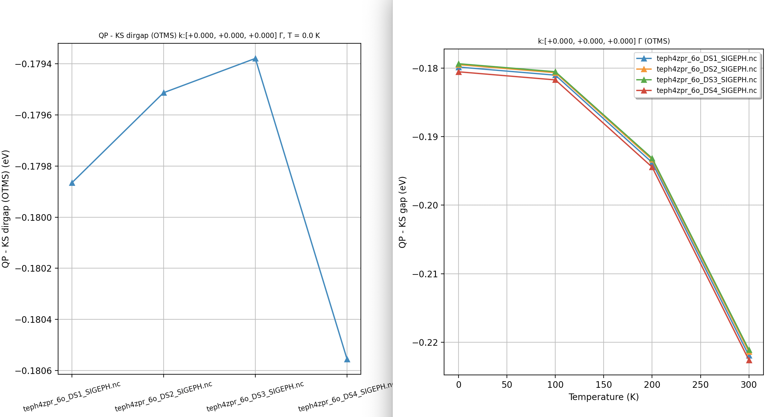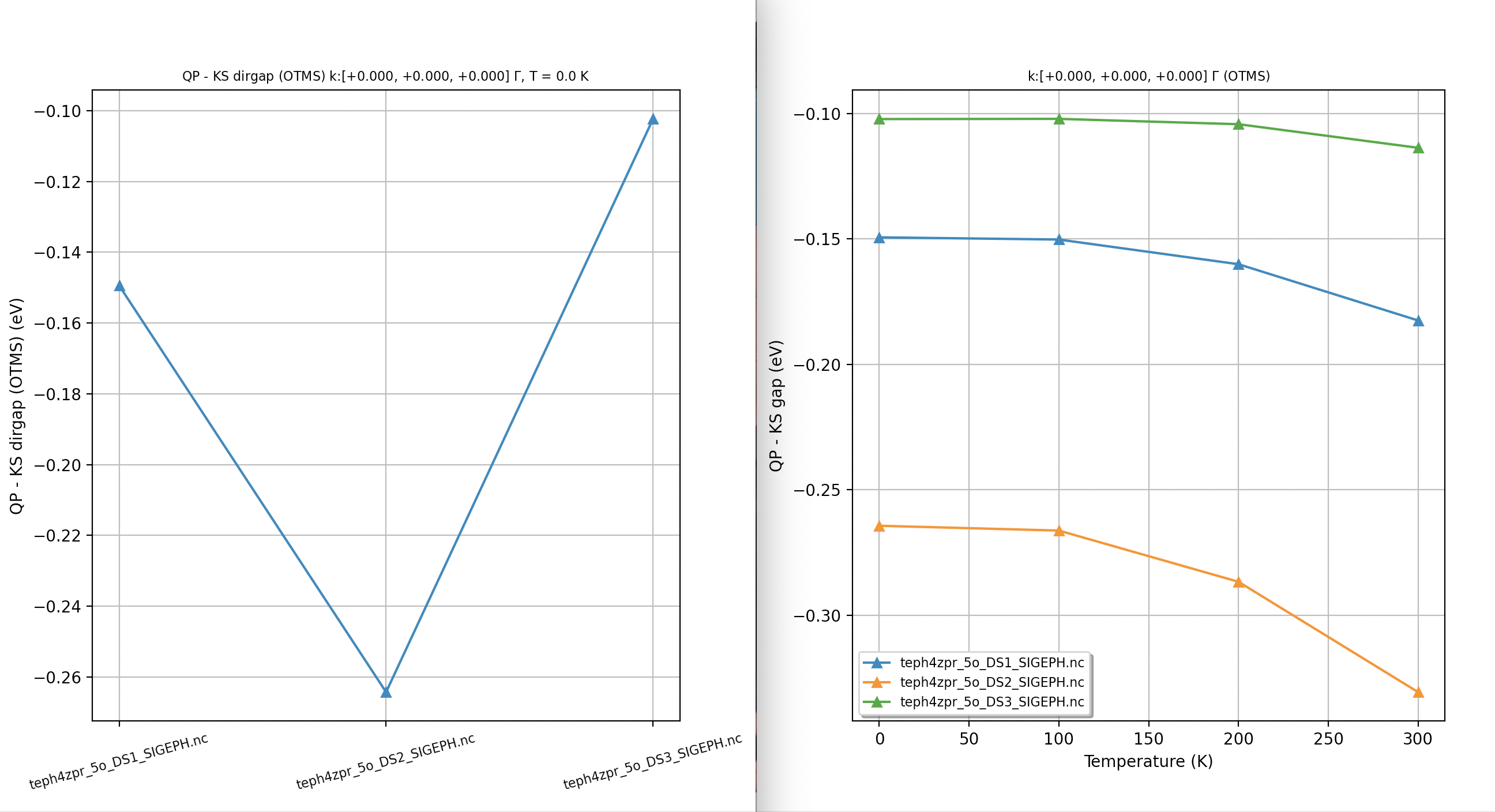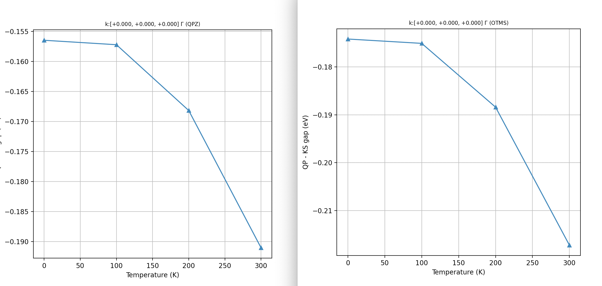 In semiconductors and insulators, indeed, most of the temperature dependence of the electronic properties at “low” T originates from the e-ph interaction and the thermal expansion of the unit cell (topic that, however, won’t be discussed in this lesson). Corrections due to \Sigma^{\text{e-e}} are obviously important as it is well known that KS gaps computed with LDA/GGA are systematically underestimated compared to experimental data. Nevertheless, the temperature dependence of \Sigma^{\text{e-e}} is rather small as long as kT is smaller than the fundamental gap (let’s say 3 kT < E_{\text{g}}).