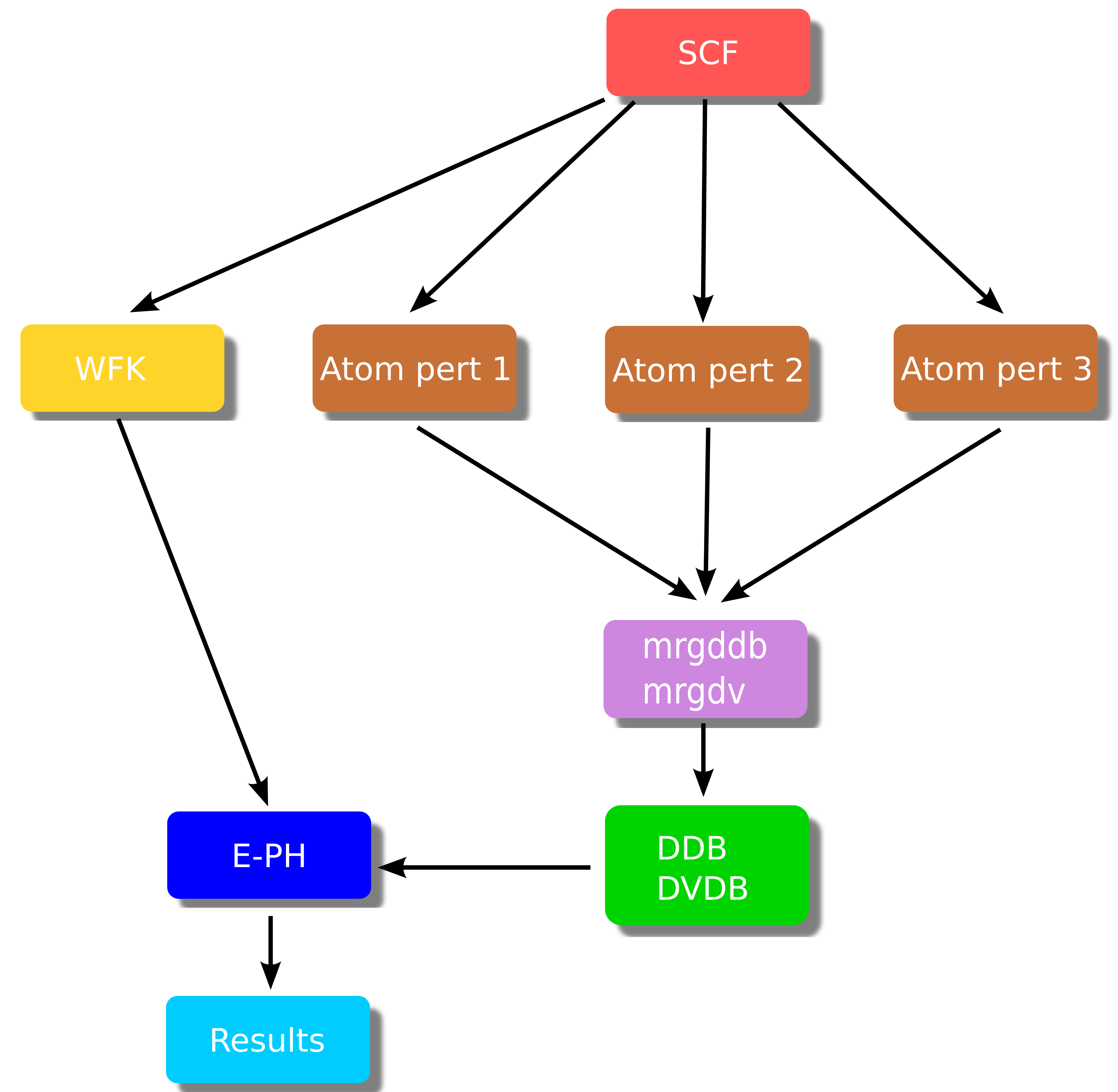 The EPH driver (blue box) receives in input the total DDB and the DVDB as well as a GS WFK file that is usually produced with a different \kk-mesh (in some cases, even with a different number of bands when high-energy empty states are needed). These ingredients are then used to compute (interpolate) e-ph matrix elements and the associated physical properties.