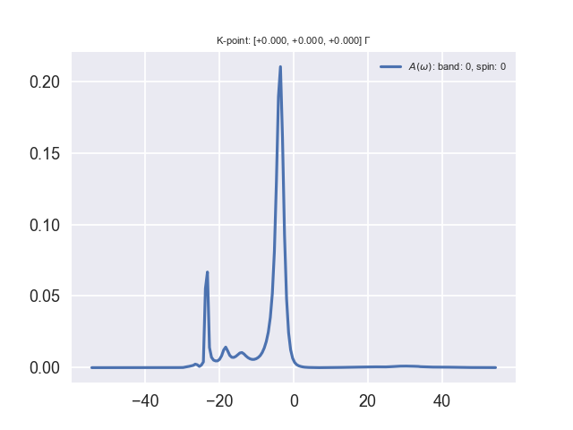 Remember that the spectral function is proportional to (with some multiplicative matrix elements) the spectrum which is measured in photoemission spectroscopy (PES). In PES, a photon impinges the sample and extracts an electron from the material. The difference of energy between the incoming photon and the obtained electron gives the binding energy of the electron in the solid, or in other words the quasiparticle energy or the band structure. In simple metals, an additional process can take place easily: the impinging photon can extract an electron together with a global charge oscillation in the sample. The extracted electron will have a kinetic energy lower than in the direct process, because a part of the energy has gone to the plasmon. The electron will appear to have a larger binding energy… You will see that the spectral function of Aluminum consists of a main peak which corresponds to the quasiparticle excitation and some additional peaks which correspond to quasiparticle and plasmon excitations together.