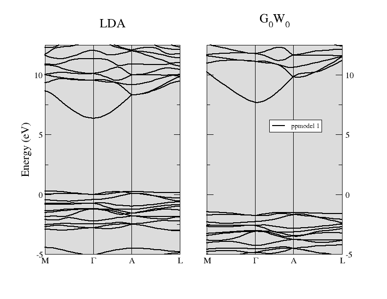 The comparison between the LDA band structure and the G 0W0 energy bands of α-quartz SiO2 is reported in the figure below. The direct gap at Γ is opened up significantly from the LDA value of 6.4 eV to about 9.5 eV when the one- shot G0W0 method is used. You are invited to reproduce this result (take into account that this calculation has been performed at the theoretical LDA parameters, while the experimental structure is used in all the input files of this tutorial).