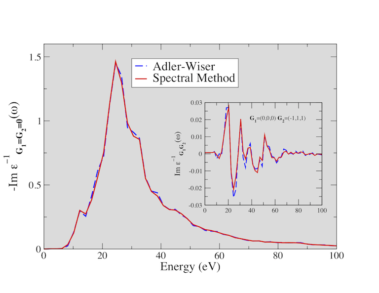 The input file is similar to the one we used for the Adler-Wiser calculation. The input variable spmeth enables the spectral method. nomegasf defines the number of ω′ points in the linear mesh used for the spectral function i.e. the number of ω′ in the equation for the spectral function.